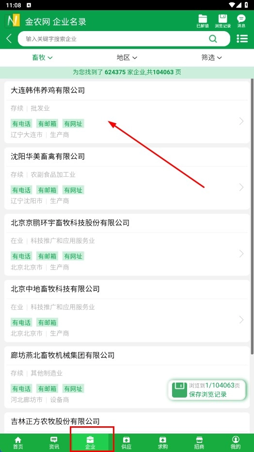 2、点击底部的【企业】功能按钮,进入企业名录页面后,就能查看包括大连韩伟养鸡有限公司在内的各类企业信息。