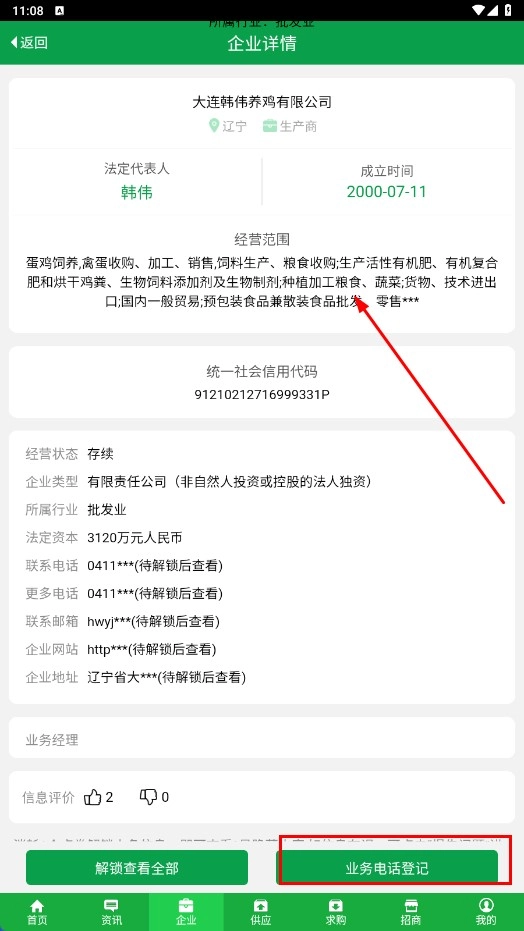 进入企业详情页面后,能够查看企业经营范围、法定代表人等相关信息,同时还能完成业务电话的登记操作。