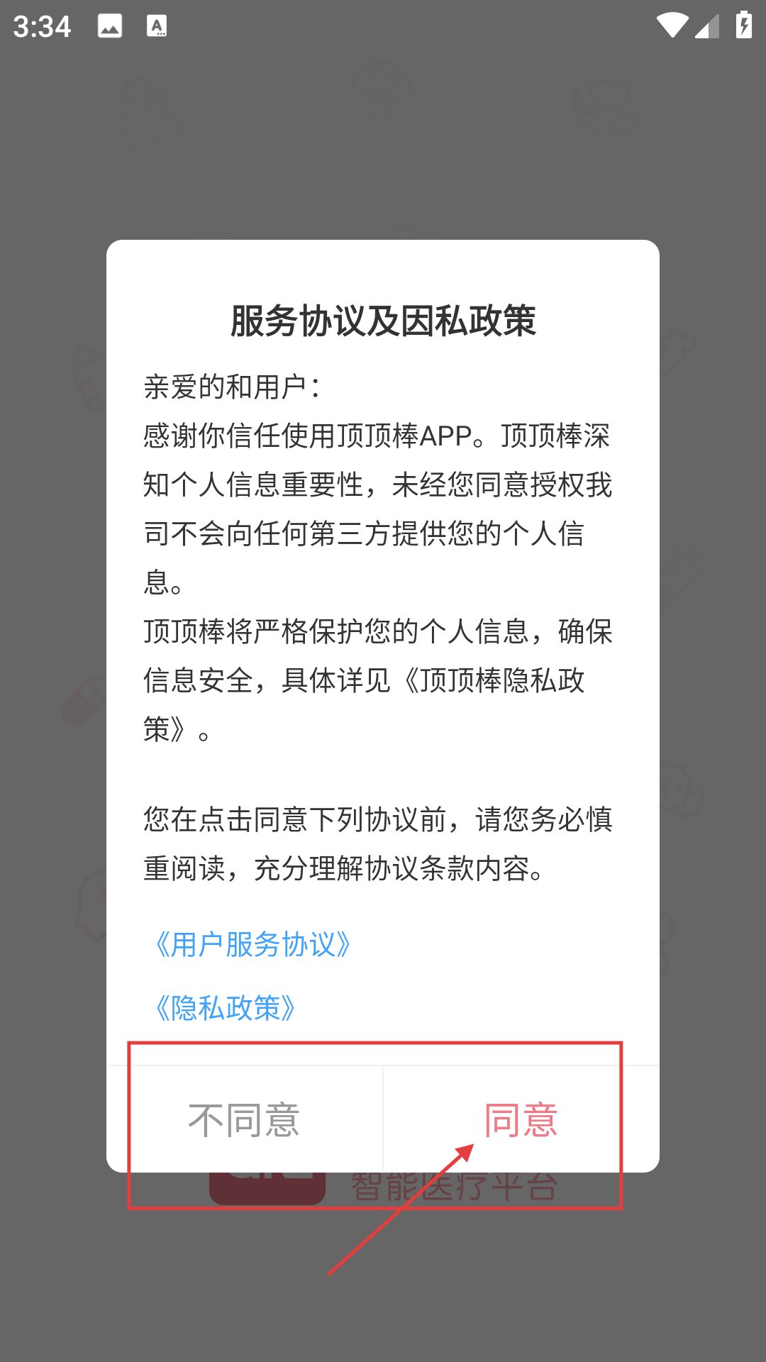 1、启动应用时,会弹出服务协议与隐私政策的说明界面,点击【同意】按钮后,即可进入后续操作界面。