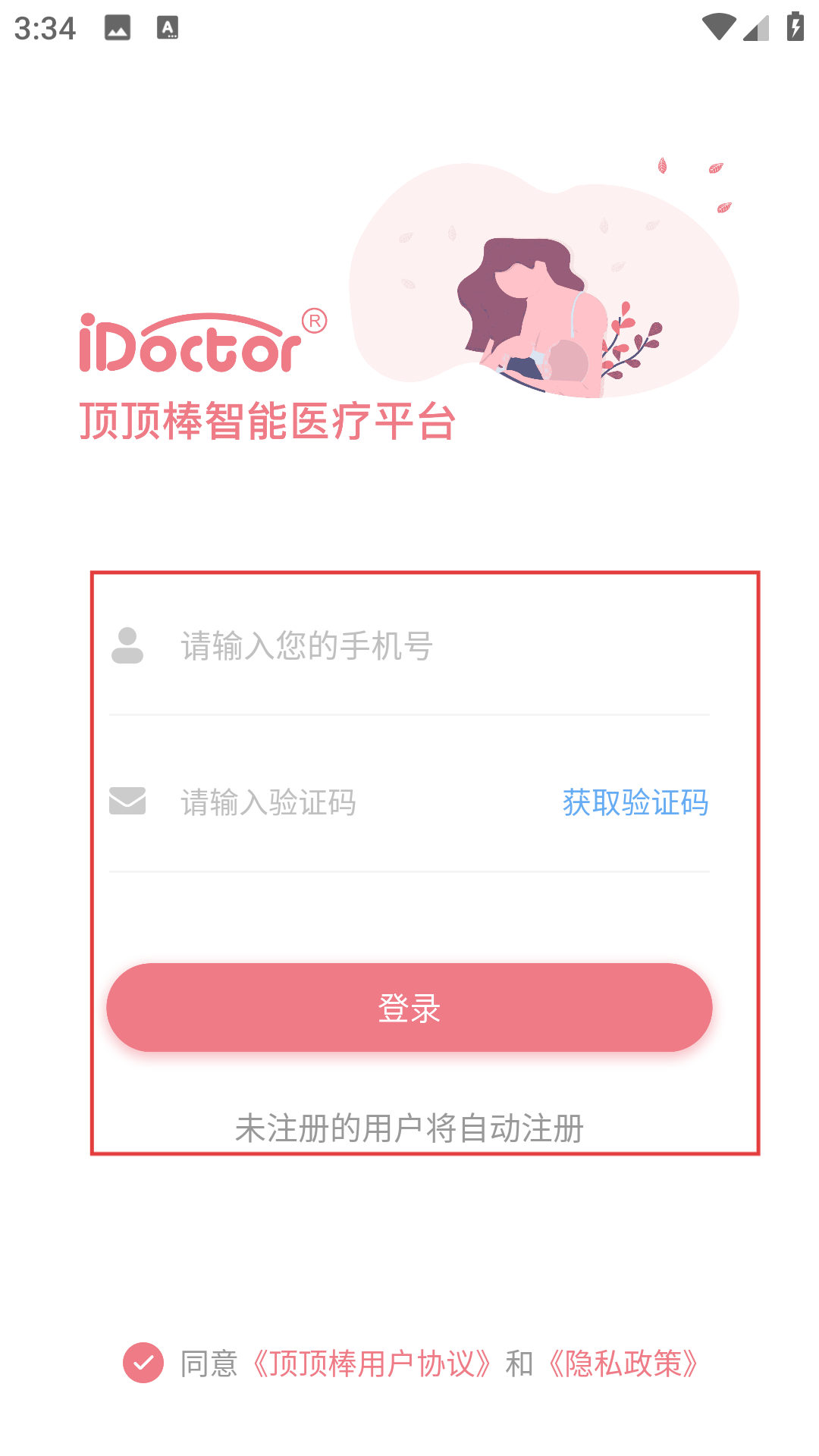 3、输入【手机号码】,点击【获取验证码】按钮,待收到短信验证码后将其输入,再点击【登录】按钮,就能进入顶顶棒智能医疗平台了。