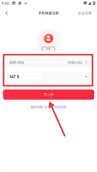 4、在手机快速注册页面,输入手机号后,点击【下一步】按钮,进行后续注册操作。