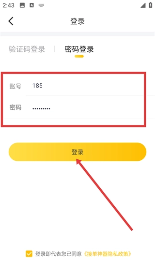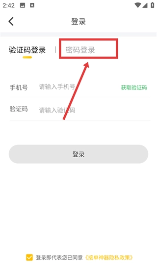 1、进入接单神器登录页面,点击【密码登录】选项,切换至密码登录模式。