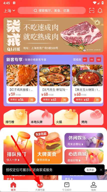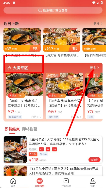 1、启动美味不用等应用,点击底部导航栏中的“大牌特惠”选项,即可进入大牌特惠页面。