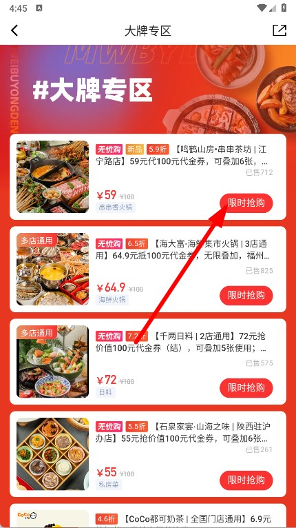 3在大牌专区的列表页面,找到你想要的代金券后,点击该券右边的限时抢购按钮。