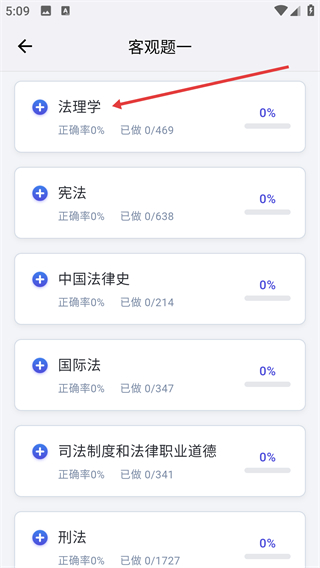 2、在客观题一页面点击【法理学】选项,展开法理学的章节内容。