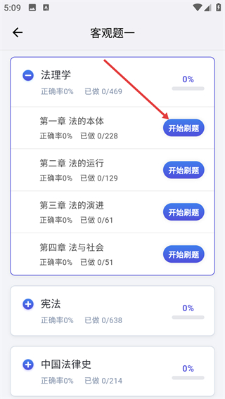 3、在法理学章节内容中点击【开始刷题】按钮,进入答题页面。