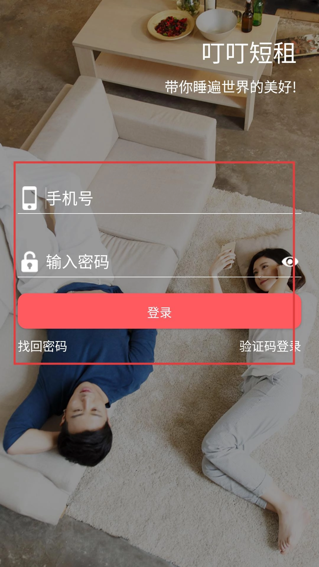 4、也可选择密码登录方式,输入【手机号】和【密码】后点击【登录】,即可进入“叮叮短租”平台,体验短租服务。