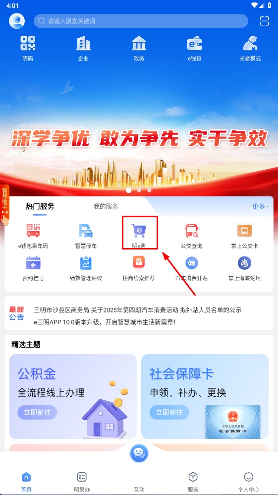 1、打开e三明首页,找到热门服务里的【明e购】图标,点击即可进入本地生活服务购物平台。