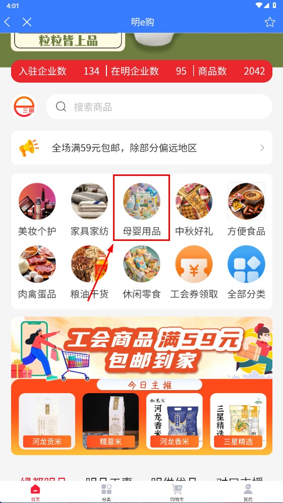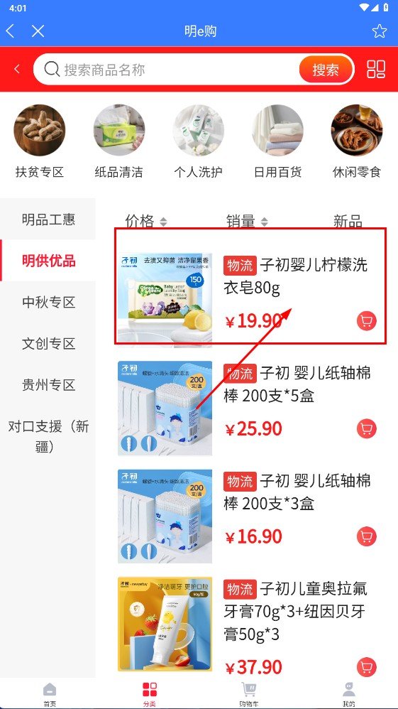 2、在明购页面,选择如【母婴用品】分类,可查看该类别下的各类母婴相关商品列表。