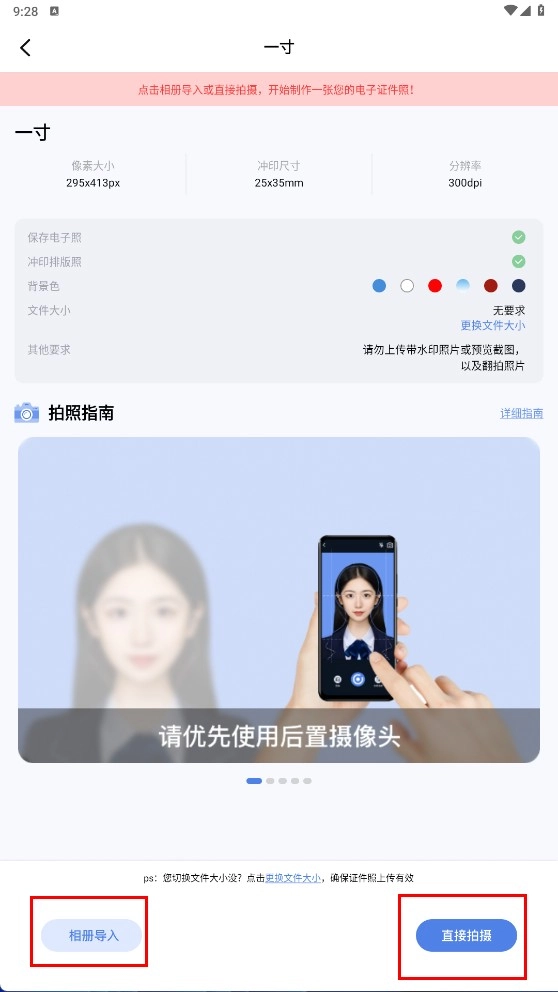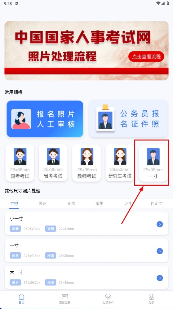2、在规格选择界面,选【一寸】证件照规格,匹配考试或证件需求。