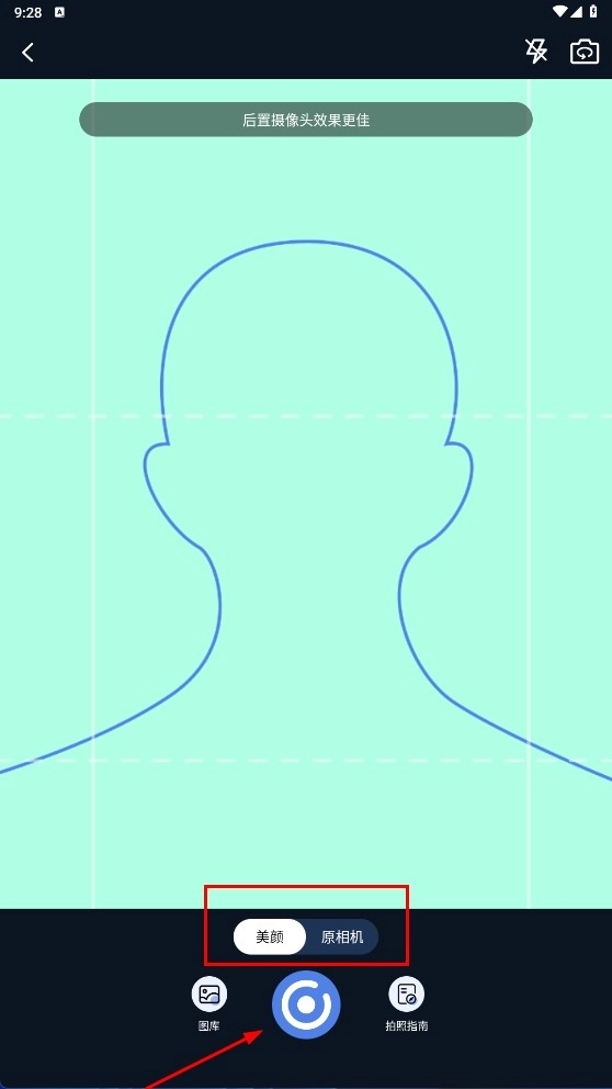 4、拍摄时,选【美颜】或【原相机】模式,对准人像轮廓框拍摄,生成合规证件照。