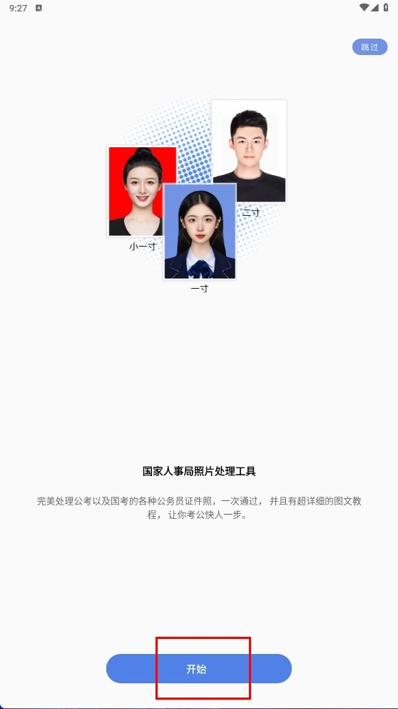 1、点击【开始】,进入国家人事局照片处理工具,开启证件照制作流程。