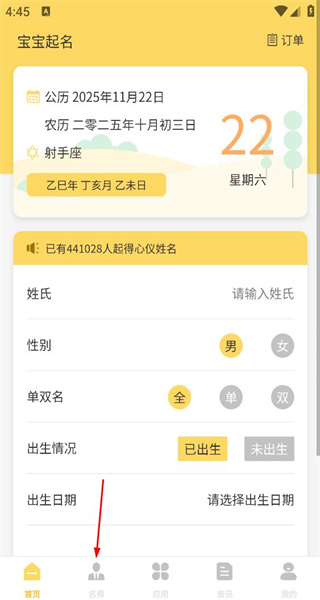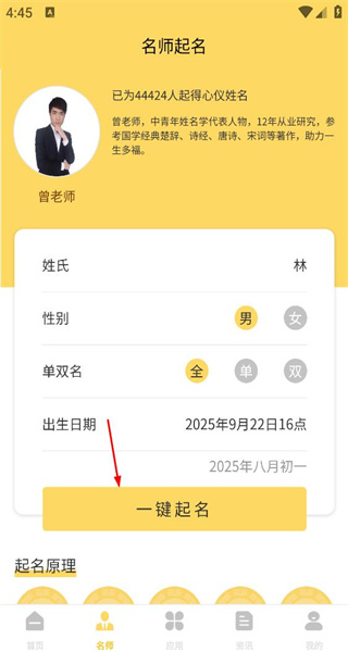 2、在名师起名页面,输入姓氏、选择性别和出生日期,点击一键起名,生成推荐姓名。