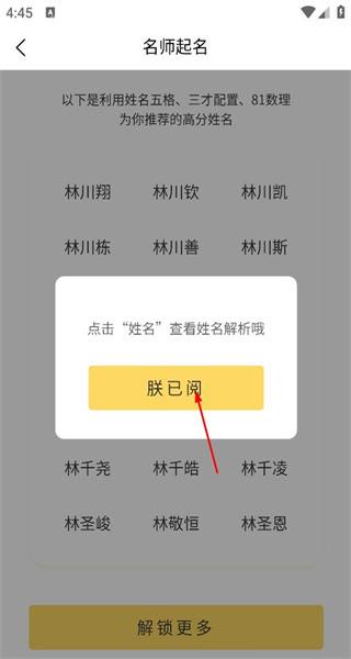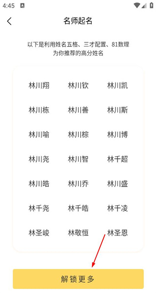 4、查看姓名推荐列表后,看到解锁更多按钮,点击该按钮,获取更多高分姓名推荐。