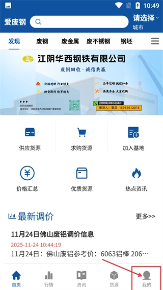 2、在【爱废钢】首页,若要使用个人相关功能,可点击底部导航栏的【我的】选项,即可进入对应的页面。