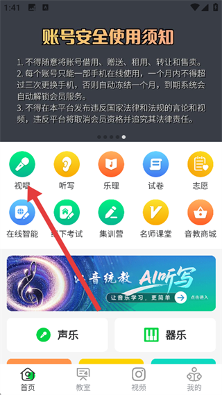 1、使用前请阅读【账号安全使用须知】,了解账号借用、手机更换等规则后,点击【视唱】功能入口。
