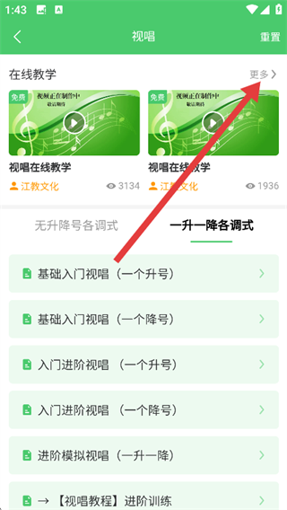 2、进入【视唱】页面后,点击【在线教学】右侧的【更多】按钮,查看更多视唱教学资源。