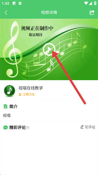 4、在【视频详情】页,可点击播放按钮观看【视唱在线教学】视频,还可查看视频简介和评论。