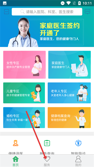 1、在医疗健康首页底部找到【服务】按钮并点击,进入服务功能页面后,即可使用健康工具等各类服务。