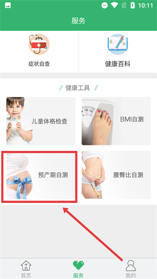 2、在【服务】页面的健康工具区域,点击【预产期自测】,进入预产期计算页面。