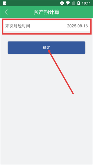 3、进入预产期计算页面后,填写【末次月经时间】,随后点击【确定】按钮,即可生成计算结果。