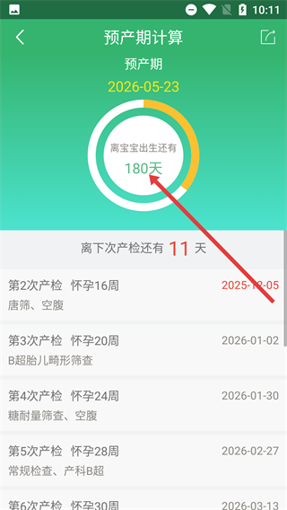 4、进入预产期计算结果页面后,可查看【预产期】以及【离宝宝出生还有】的天数等相关信息,以此掌握孕期的进展情况。