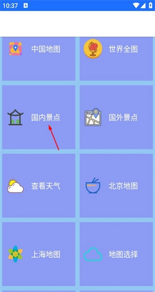 打开软件后,进入功能选择界面,能看到国内景点、国外景点等板块,点击国内景点板块,即可进入省份选择页面。