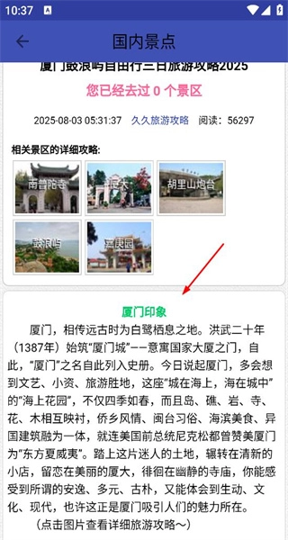 4、进入厦门攻略详情页后,查看相关景区的介绍以及关于厦门印象的文字说明,通过浏览攻略内容来获取厦门旅游的相关信息。