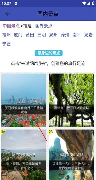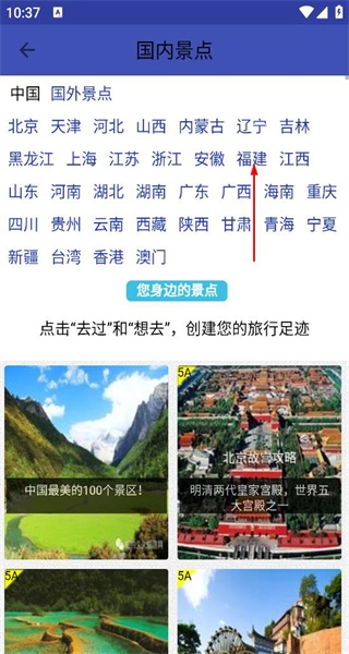 在国内景点的省份选择界面,能看到北京、福建等诸多省份,点击福建后,即可进入福建景点攻略的列表页面。