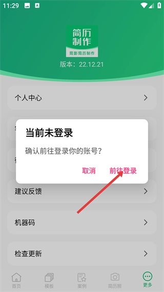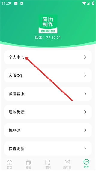 1、在简影简历制作首页底部找到【更多】按钮并点击,即可进入更多功能页面。