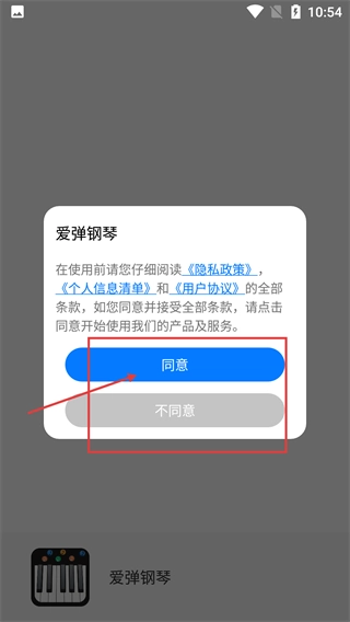 1、进入【爱弹钢琴】前,需阅读《隐私政策》,点击【同意】按钮以使用产品服务。
