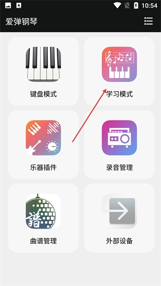 2、在【爱弹钢琴】主界面,点击【学习模式】选项,可进入琴谱相关的学习功能模块,开启钢琴学习流程。
