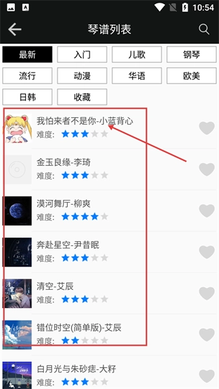 3、在【琴谱列表】页面,可按分类筛选琴谱,选择目标曲目(如《我怕来者不是你-小蓝背心》),即可进入曲目学习准备界面。