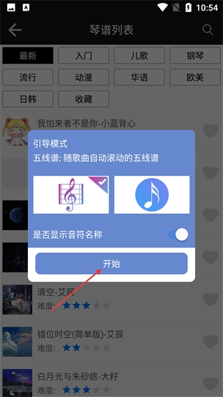 4、选择曲目后,在弹出的设置窗口中确认引导模式(如五线谱),可开启【是否显示音符名称】,点击【开始】进入学习演奏。