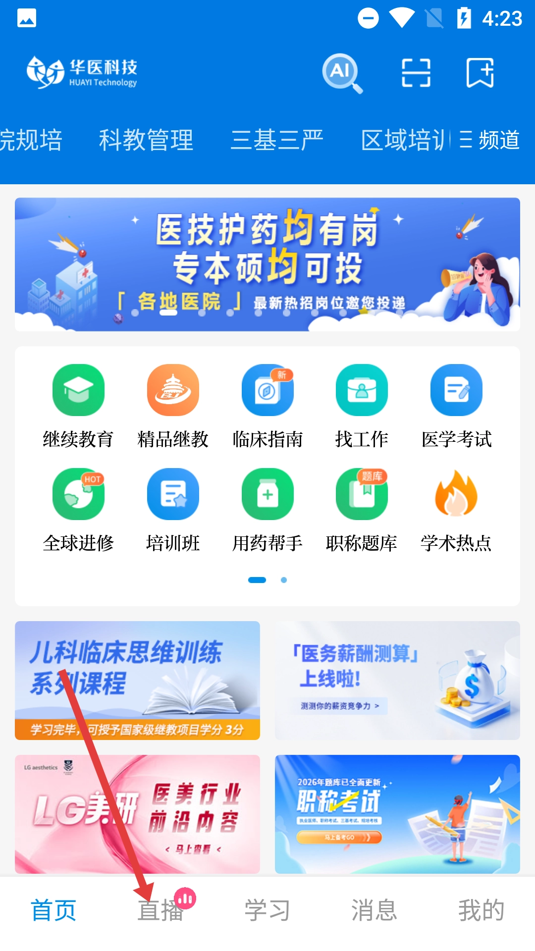1、在华医科技应用首页,点击底部【直播】选项,进入直播板块页面。