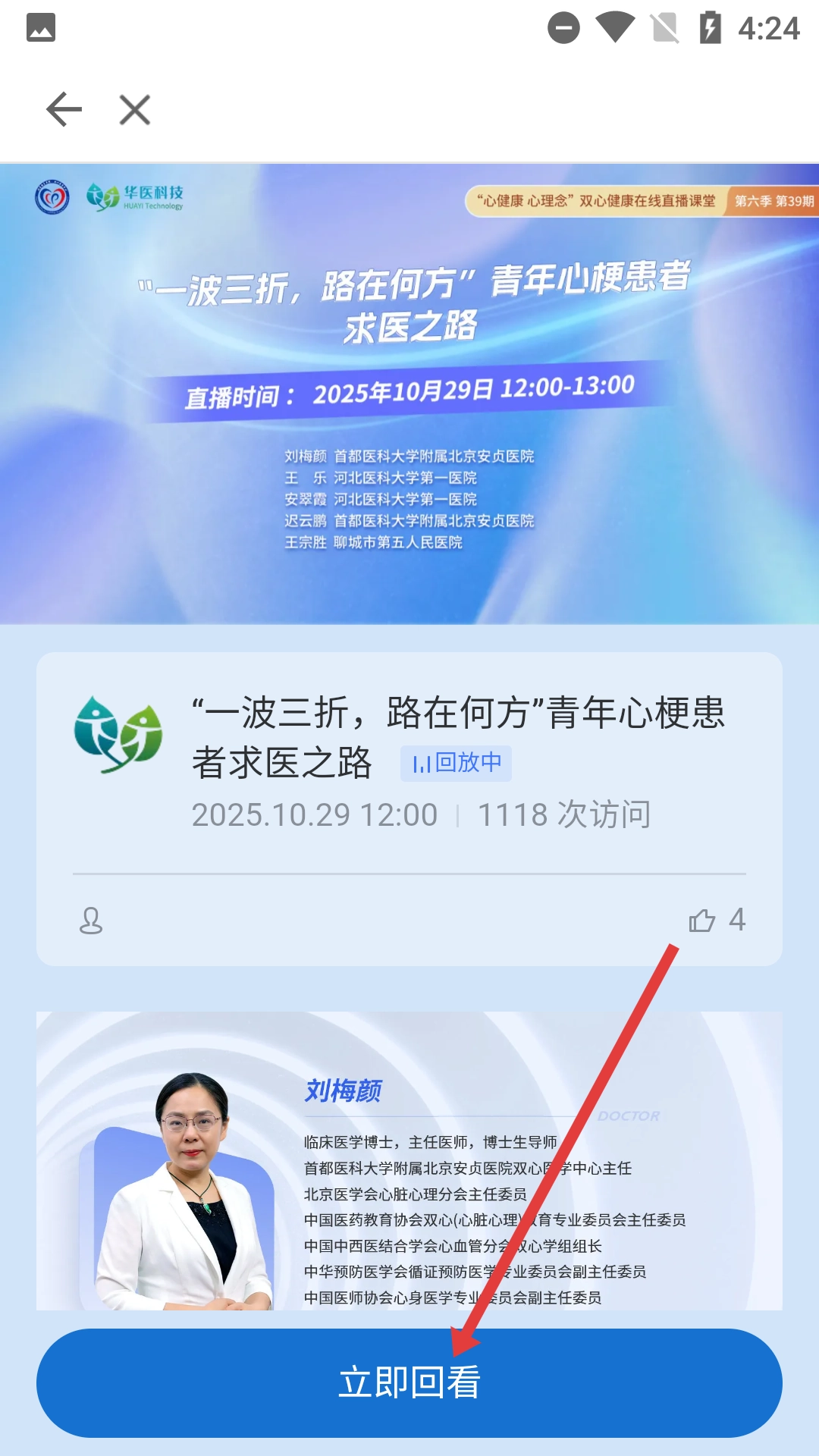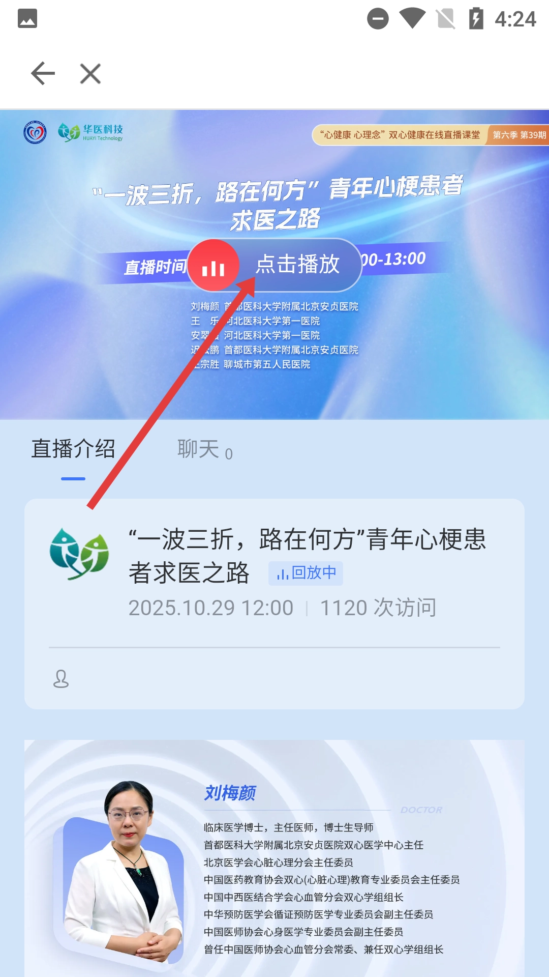 2、在直播板块页面,选择感兴趣的直播回放,如【“一波三折,路在何方”青年心梗患者求医之路】。