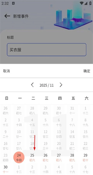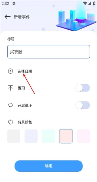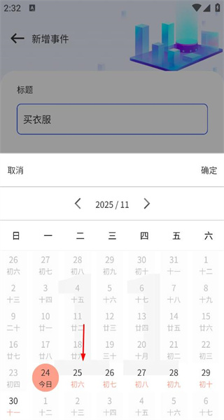 1、打开软件后,进入新增事件页面,在标题栏填写买衣服,然后点击选择日期,进入日期选择界面。