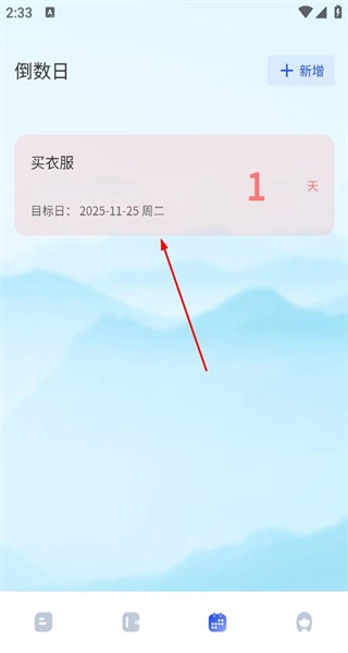 4、事件添加成功后,进入倒数日主页面,可看到“买衣服”事件的倒数信息,显示距离目标日的天数,完成新增事件的整个流程。