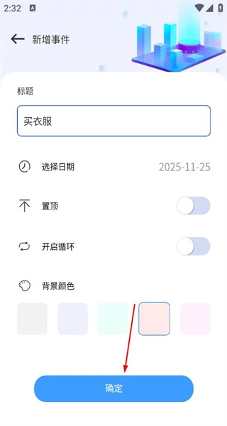 3、设置好日期后,回到新增事件页面,确认其他选项后点击确定按钮,完成事件的添加操作。