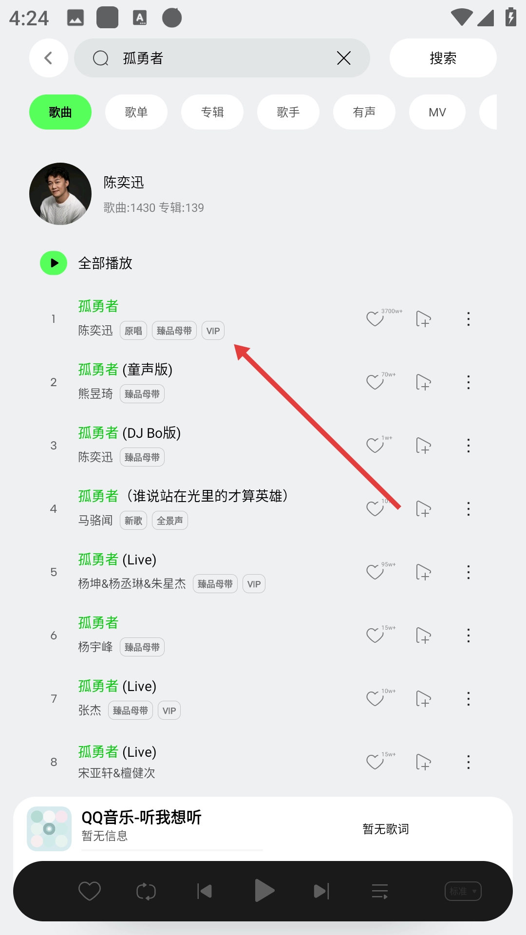 3、在搜索结果页面点击陈奕迅演唱的【孤勇者】歌曲。
