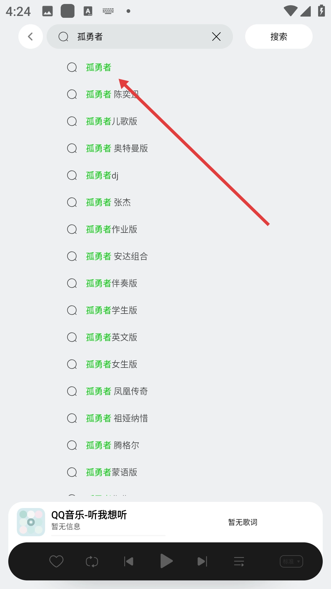2、在搜索页面输入“孤勇者”,选择搜索建议中的【孤勇者】。