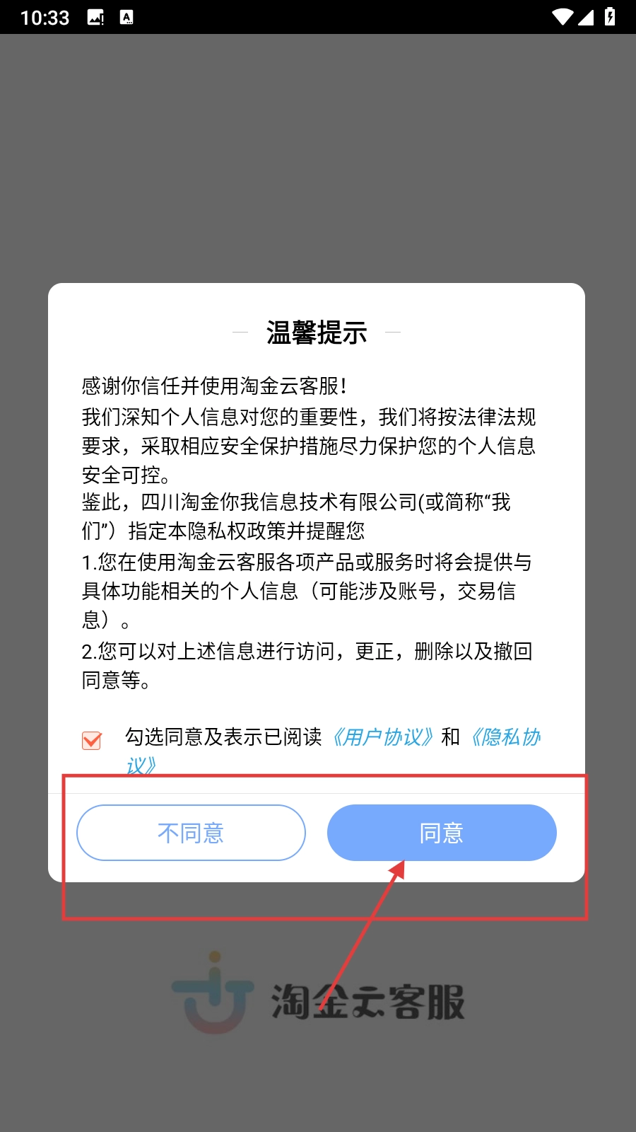 1、打开淘金云客服软件,在温馨提示页面勾选同意协议后,点击【同意】按钮,进入登录页面。