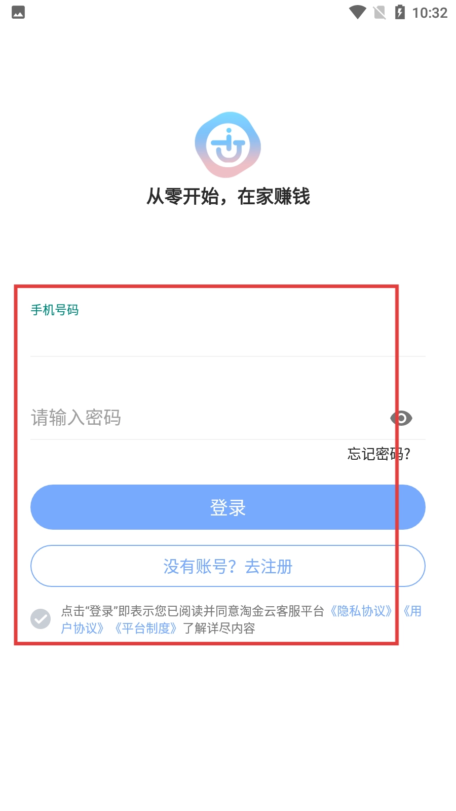2、输入手机号码和密码,勾选同意相关协议后,点击【登录】按钮完成登录;若没有账号,可点击【去注册】进行注册。