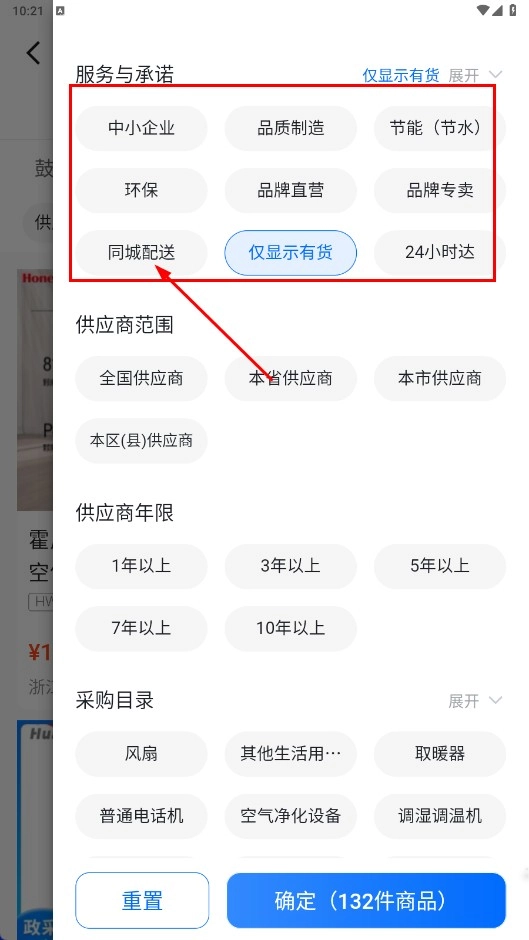 2、在筛选页面,选择【同城配送-服务标签】等筛选条件后,点击确定。