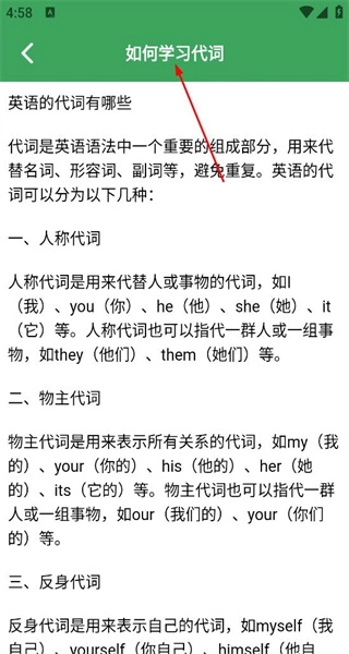 4、再次返回学习资讯页面,点击如何学习代词,进入详情页,学习代词的不同类型,掌握各类代词的具体用法。