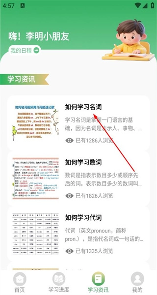 1、打开软件后,进入首页,看到我的日程板块与学习资讯区域,点击如何学习名词,进入该语法内容的详情页面。