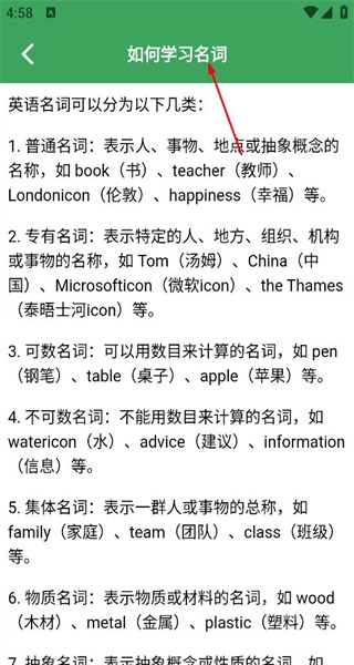 2、在如何学习名词的详情页面,看到英语名词的分类介绍,包含普通专有可数等类别,了解各类名词的学习要点。
