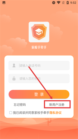 1、仔细阅读《家校手牵手用户协议与隐私政策》的相关内容后,点击弹窗里的【同意】按钮,即可进入后续的操作界面。