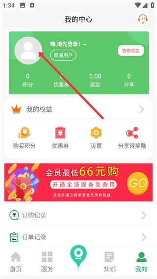 进入【我的中心】后,点击用户头像区域即可进行登录;登录成功后,不仅能查看积分、优惠券等信息,还可以使用购买积分、优惠券等功能。