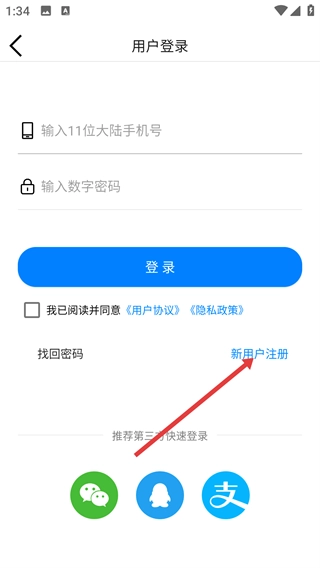 在用户登录页面,新用户既可以点击【新用户注册】按钮完成注册,也能够选择第三方快速登录的方式进行登录,不过在登录之前,需要仔细阅读并同意《用户协议》和《隐私政策》。